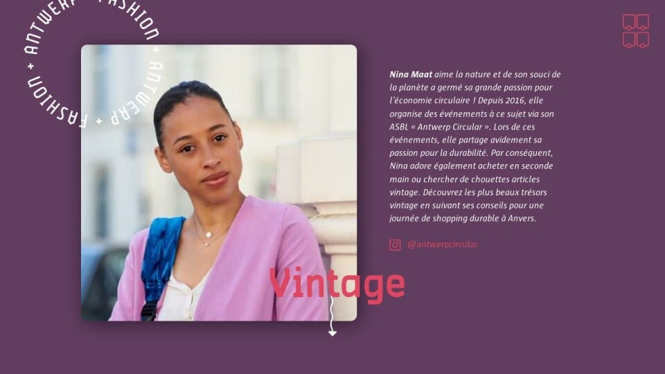 Nina Maat aime la nature et de son souci de la planète a germé sa grande passion pour l’économie circulaire ! Depuis 2016, elle organise des événements à ce sujet via son ASBL « Antwerp Circular ». Lors de ces événements, elle partage avidement sa passion pour la durabilité. Par conséquent, Nina adore également acheter en seconde main ou chercher de chouettes articles vintage. Découvrez les plus beaux trésors vintage en suivant ses conseils pour une journée de shopping durable à Anvers.